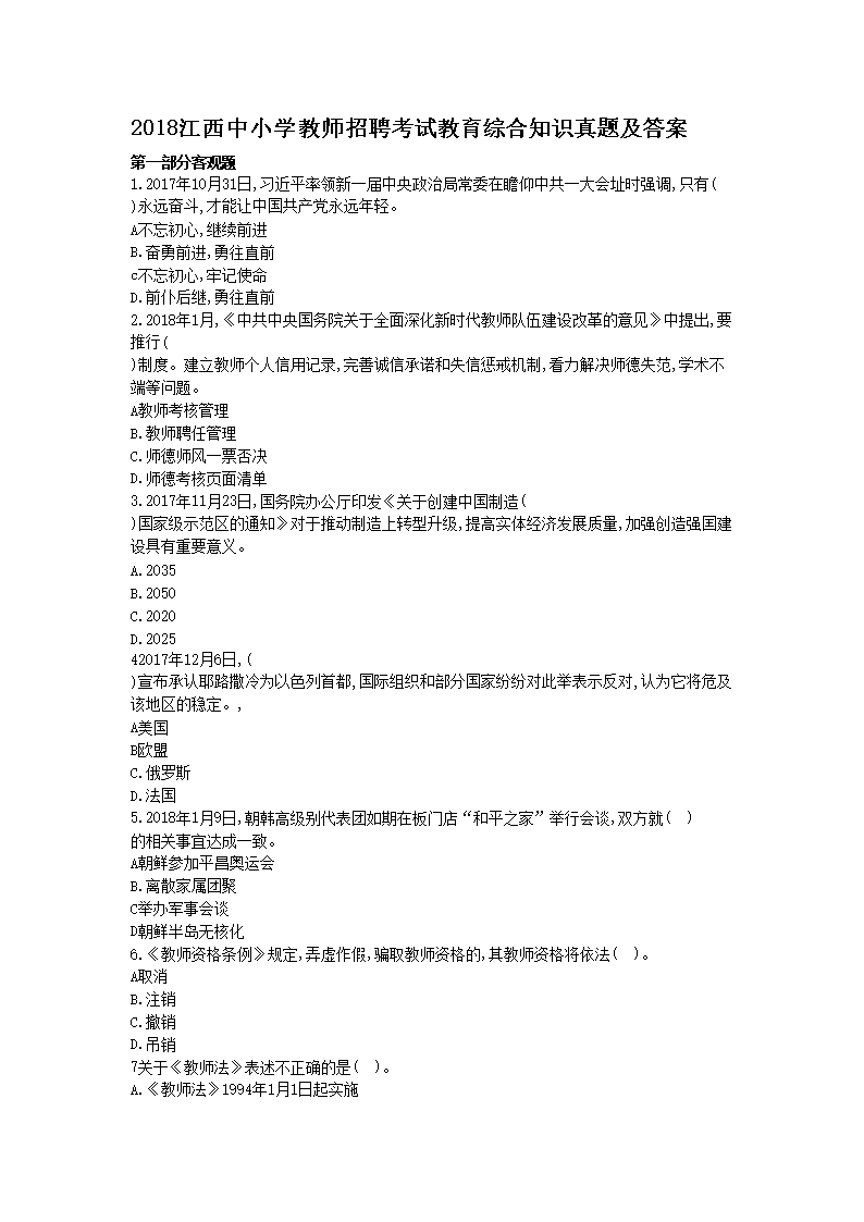 【文档预览】 无忧考网整理发布2018江西中小学教师招聘考试教育综合知识真题及答案(Word版),前五页预览如下: