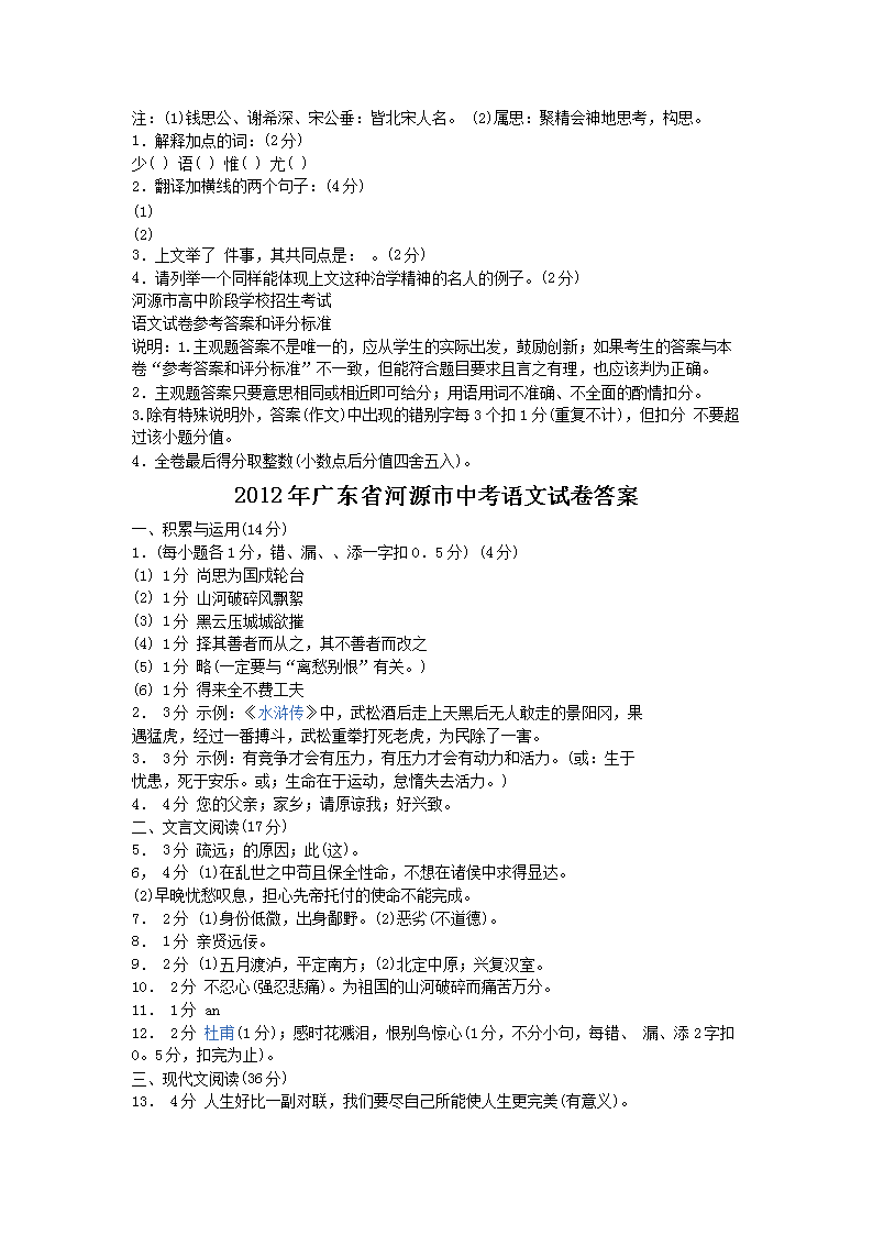 【文档预览】 无忧考网整理发布2012年广东省河源市中考语文试卷及答案(Word版),前五页预览如下: