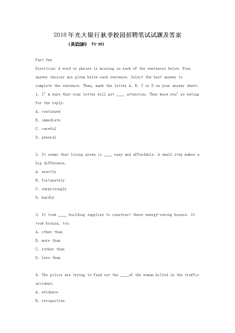 【文档名称】 2018年光大银行秋季校园招聘笔试试题及答案(Word版).doc