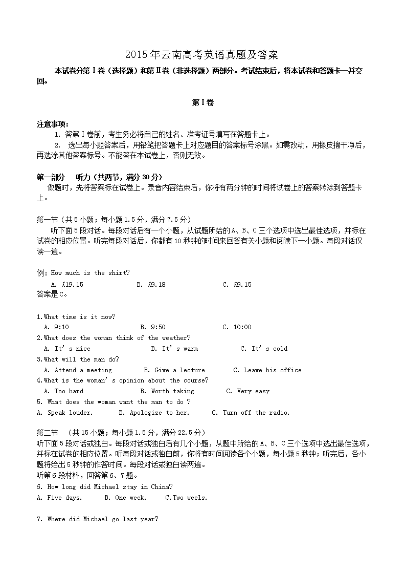 【文档名称】 2015年云南高考英语真题及答案(Word版).doc