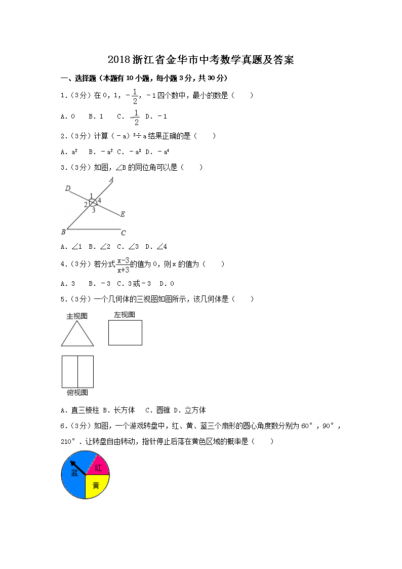 【文档名称】 2018浙江省金华市中考数学真题及答案(Word版).doc