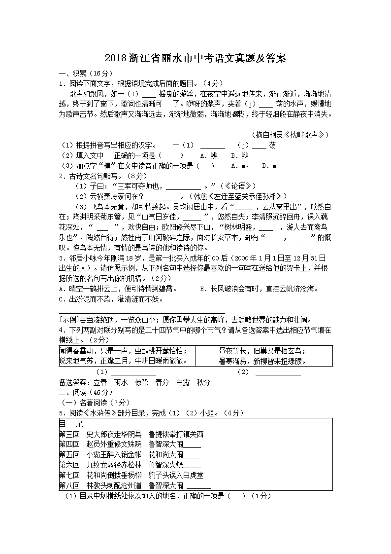 【文档名称】 2018浙江省丽水市中考语文真题及答案(Word版).doc