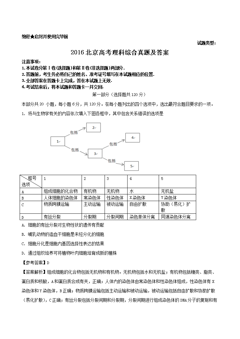 【文档名称】 2016北京高考理科综合真题及答案(Word版).doc