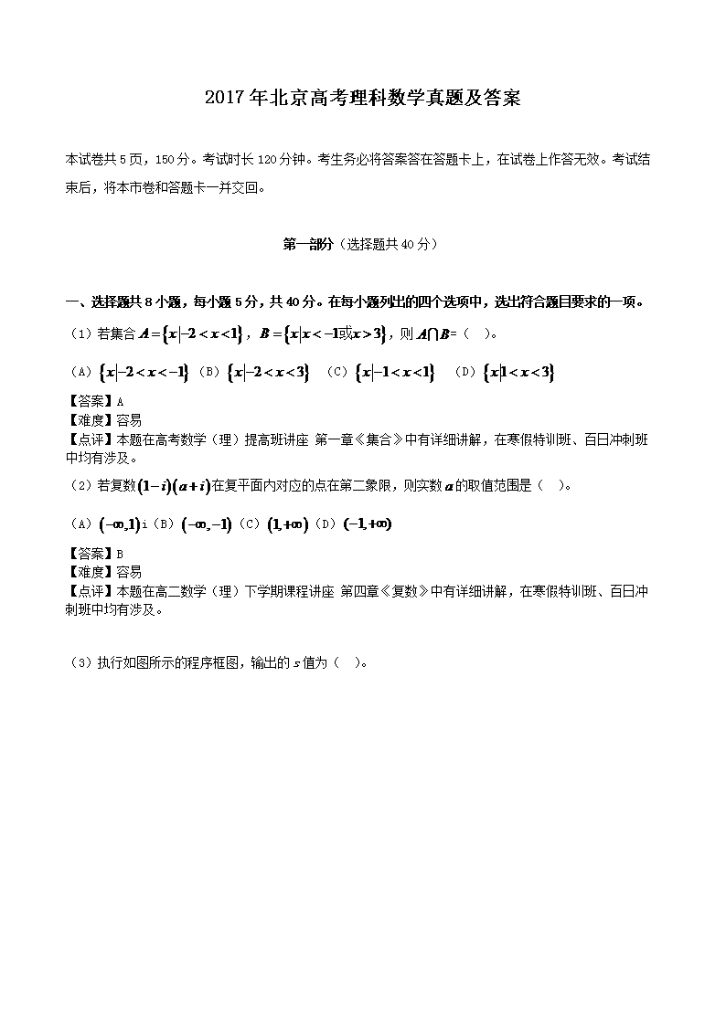 【文档预览】 无忧考网整理发布2017年北京高考理科数学真题及答案(Word版),前五页预览如下: