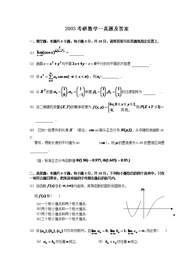 【文档名称】 2003考研数学一真题及答案(Word版).doc