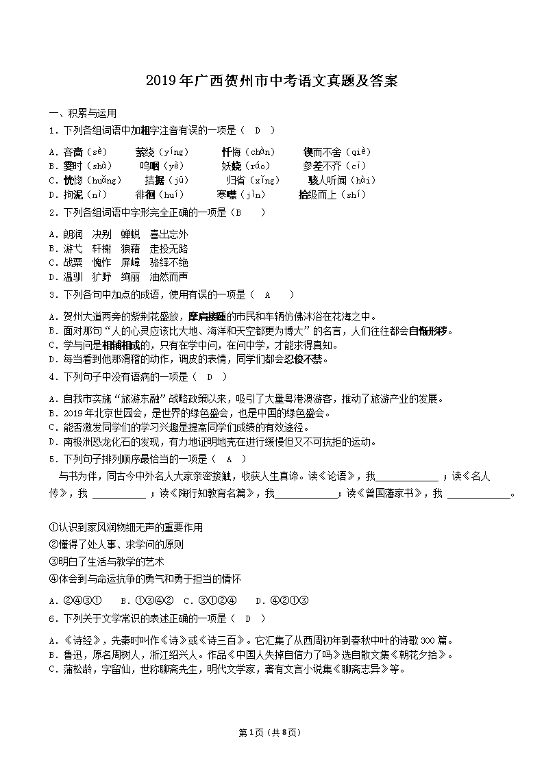 【文档名称】 2019年广西贺州市中考语文真题及答案(Word版).doc