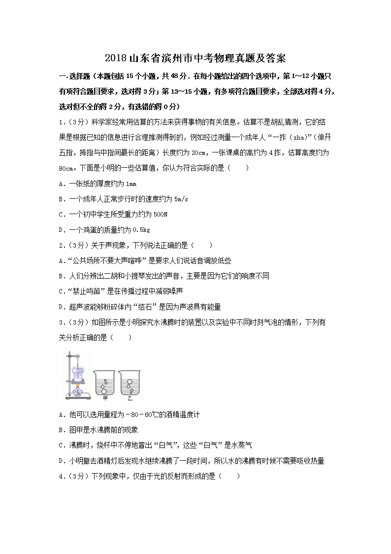 【文档名称】 2018山东省滨州市中考物理真题及答案(Word版).doc