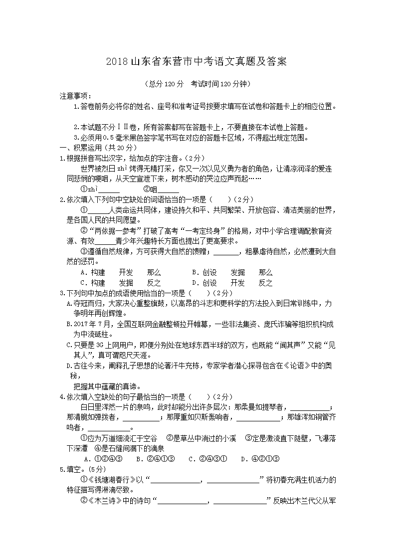 【文档名称】 2018山东省东营市中考语文真题及答案(Word版).doc