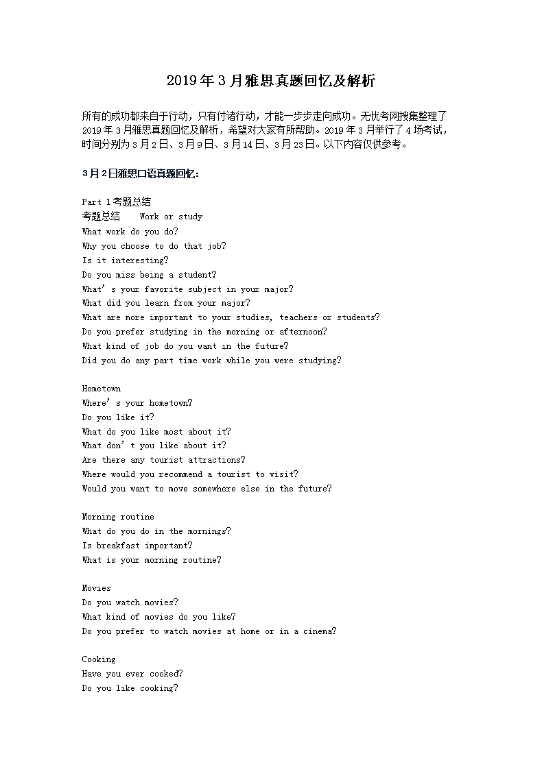 【文档预览】 无忧考网整理发布2019年3月雅思真题回忆及解析(Word版),前五页预览如下: