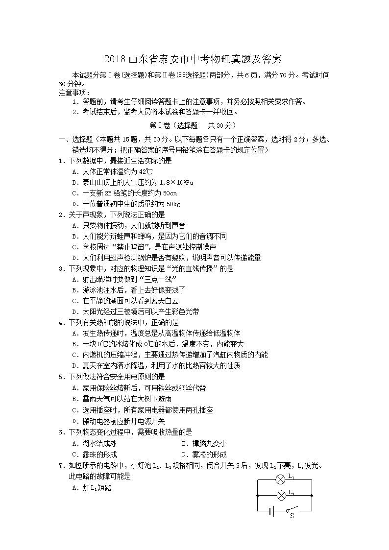 【文档名称】 2018山东省泰安市中考物理真题及答案(Word版).doc