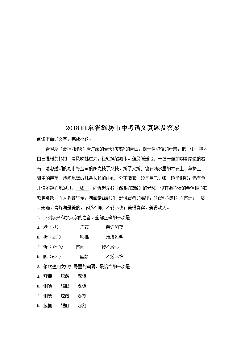 【文档名称】 2018山东省潍坊市中考语文真题及答案(Word版).doc