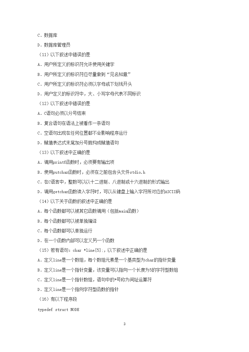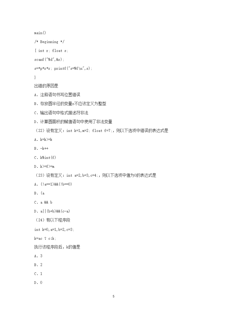 【文档名称】 2005年9月全国计算机二级C语言考试真题及答案(Word版).doc