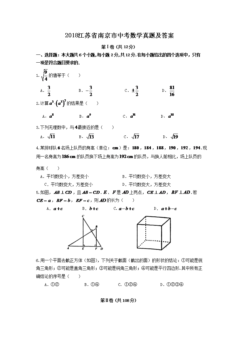 【文档名称】 2018江苏省南京市中考数学真题及答案(Word版).doc