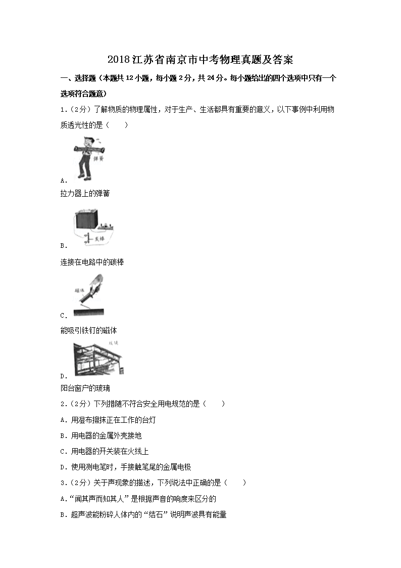【文档预览】 无忧考网整理发布2018江苏省南京市中考物理真题及答案(Word版),前五页预览如下: