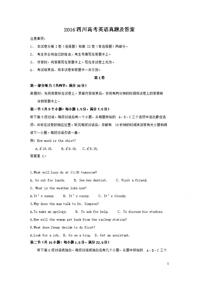 【文档预览】 无忧考网整理发布2016四川高考英语真题及答案(Word版),前五页预览如下: