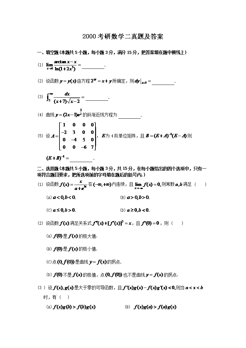 【文档名称】 2000考研数学二真题及答案(Word版).doc