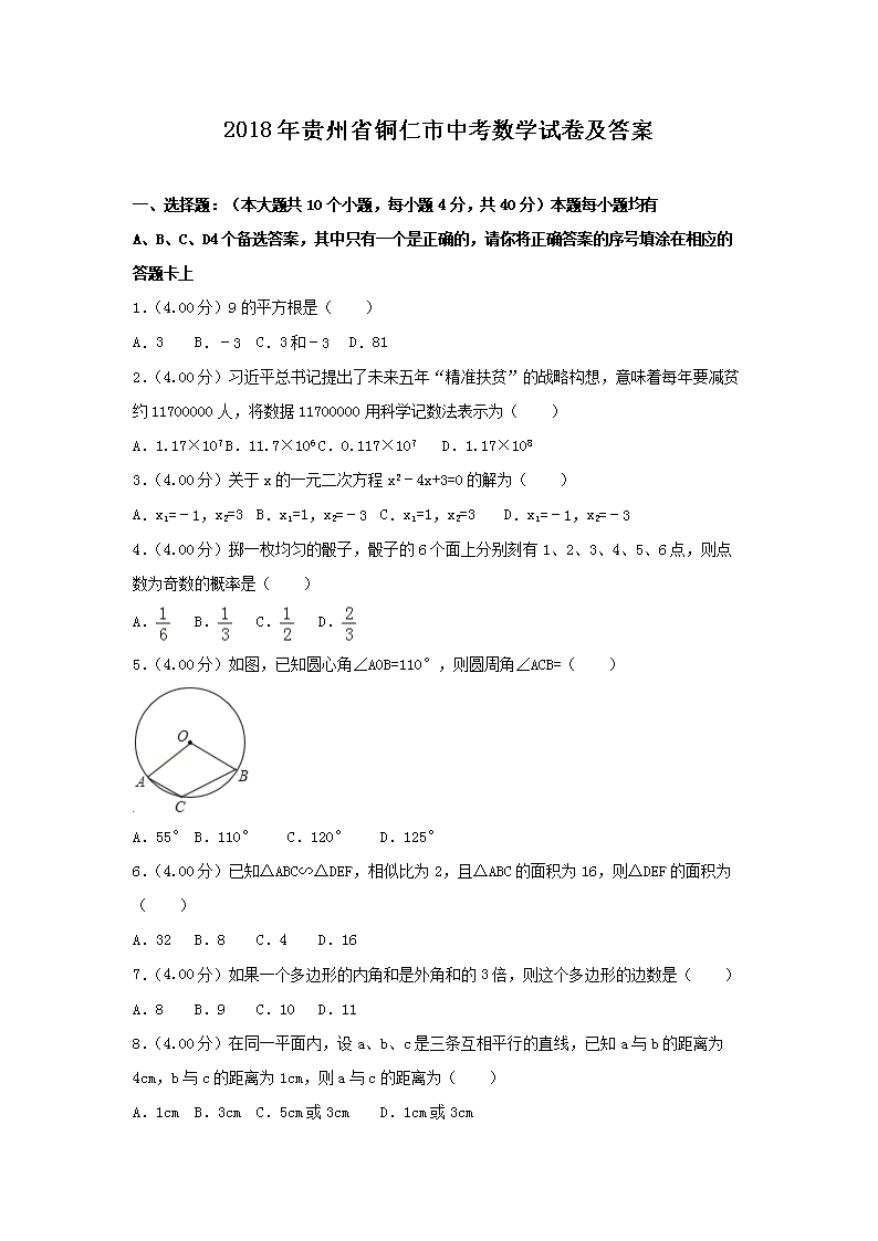 【文档名称】 2018年贵州省铜仁市中考数学试卷及答案(Word版).doc