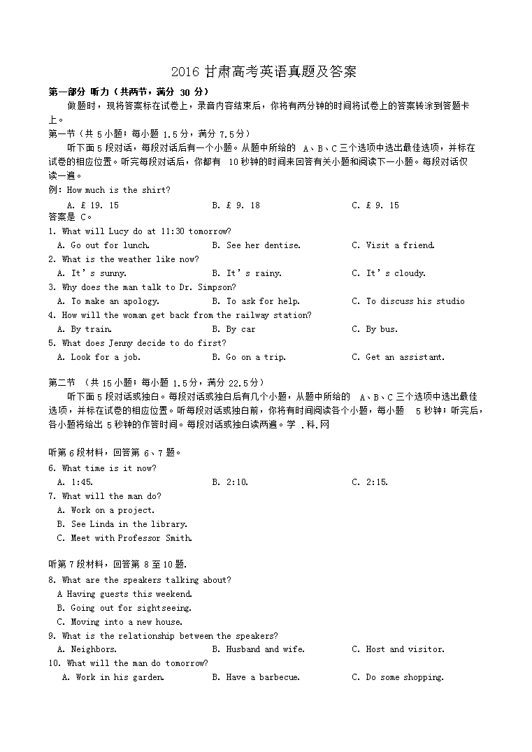 【文档预览】 无忧考网整理发布2016甘肃高考英语真题及答案(Word版),前五页预览如下: