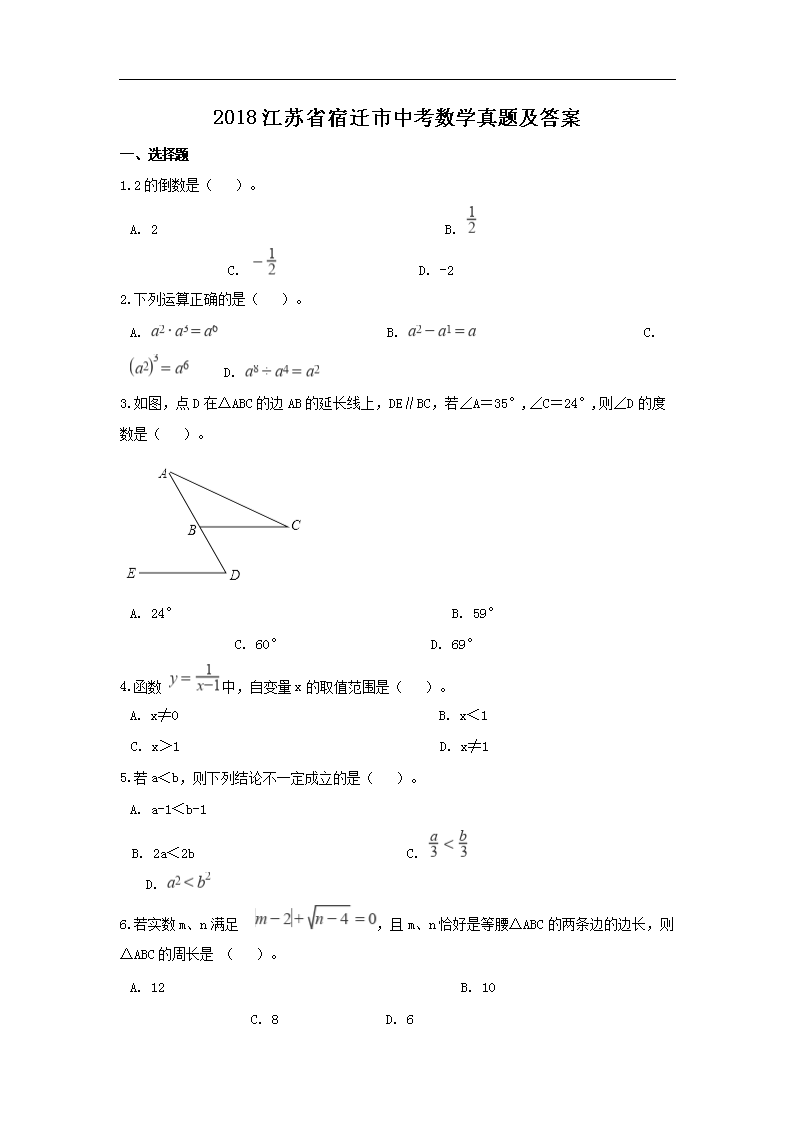 【文档名称】 2018江苏省宿迁市中考数学真题及答案(Word版).doc