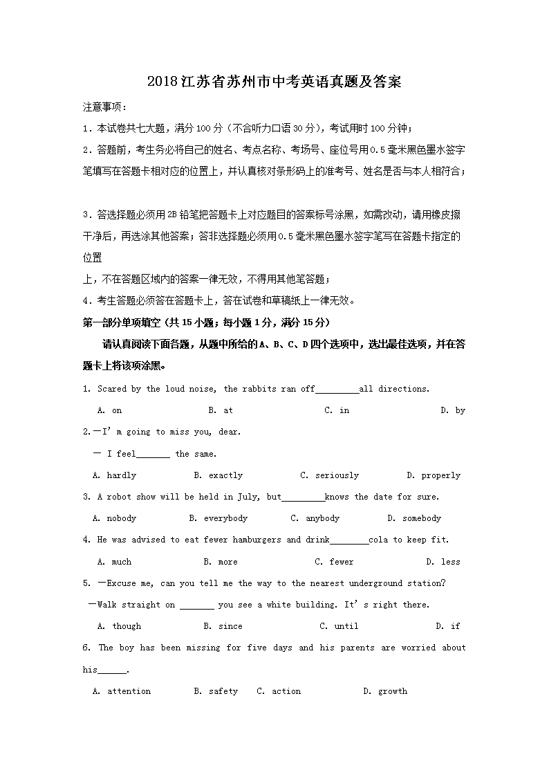 【文档预览】 无忧考网整理发布2018江苏省苏州市中考英语真题及答案(Word版),前五页预览如下: