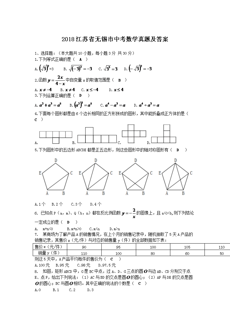 【文档预览】 无忧考网整理发布2018江苏省无锡市中考数学真题及答案(Word版),前五页预览如下: