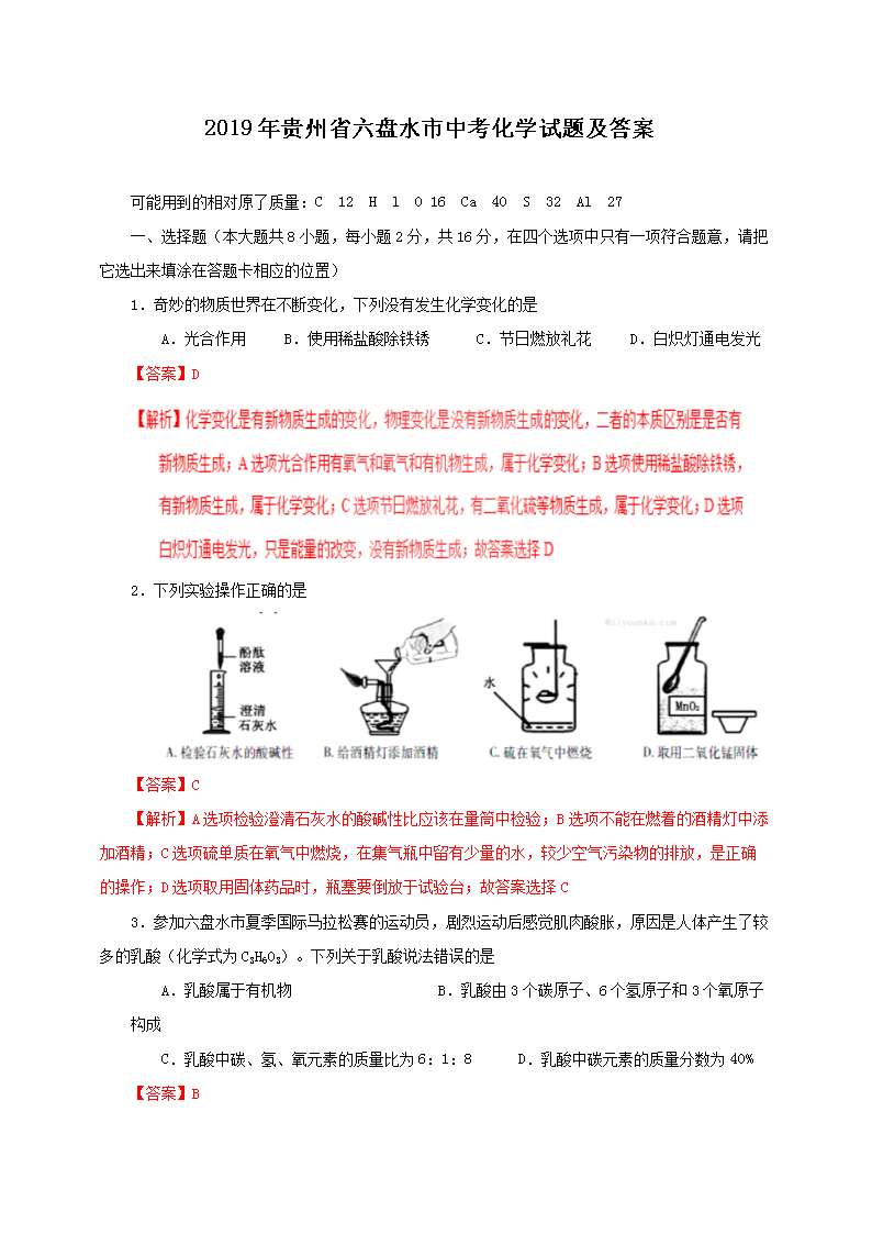 【文档名称】 2019年贵州省六盘水市中考化学试题及答案(Word版).doc