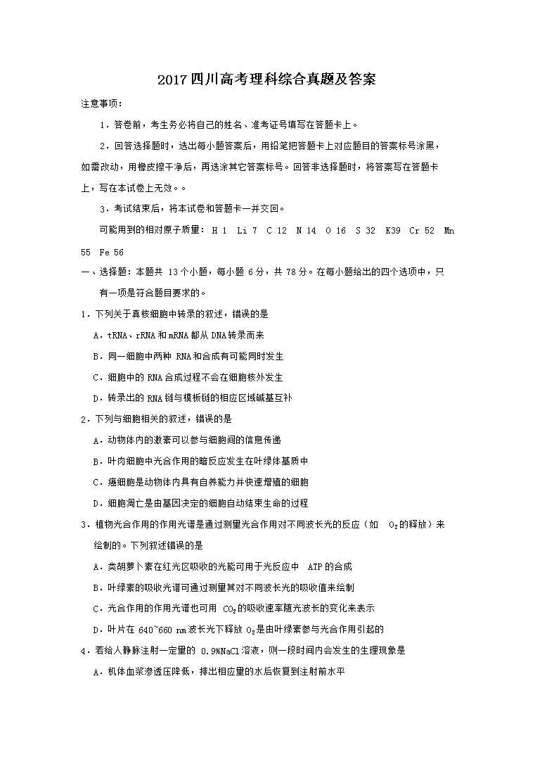 【文档名称】 2017四川高考理科综合真题及答案(Word版).doc