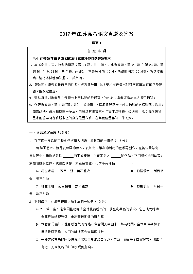 【文档预览】 无忧考网整理发布2017年江苏高考语文真题及答案(Word版),前五页预览如下:
