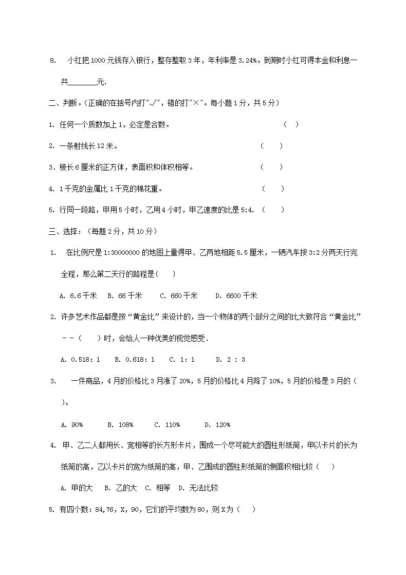 【文档名称】 2019年四川小升初数学真题及答案(Word版).doc