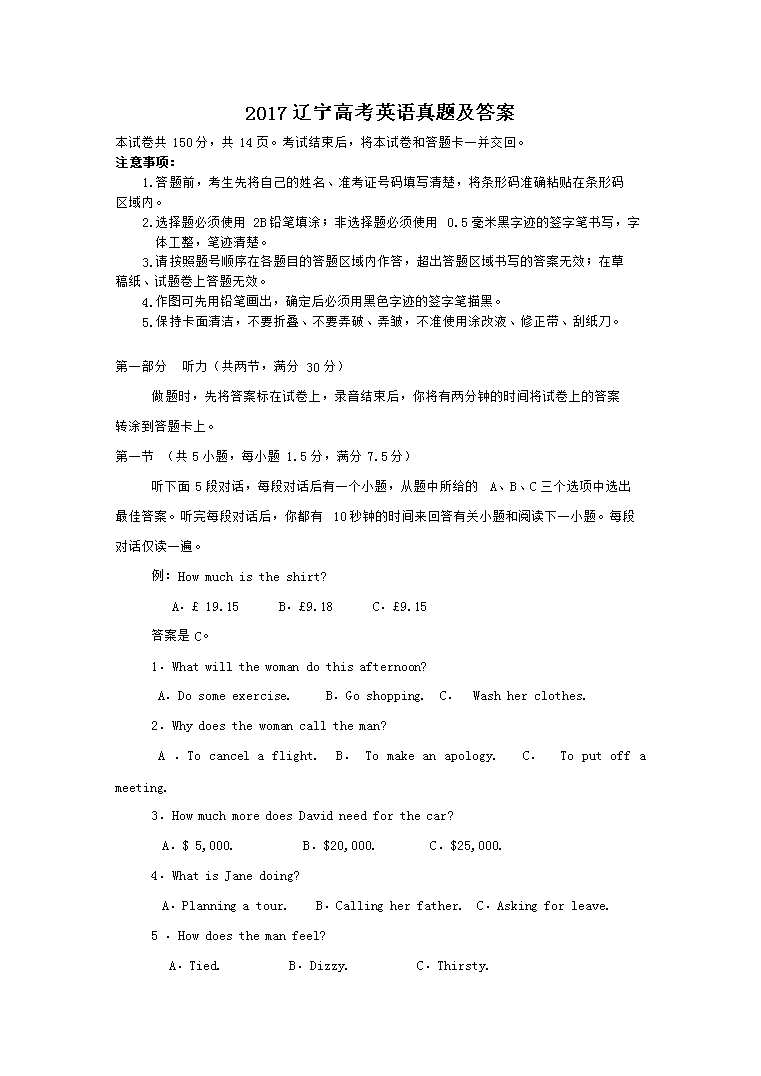 【文档预览】 无忧考网整理发布2017辽宁高考英语真题及答案(Word版),前五页预览如下: