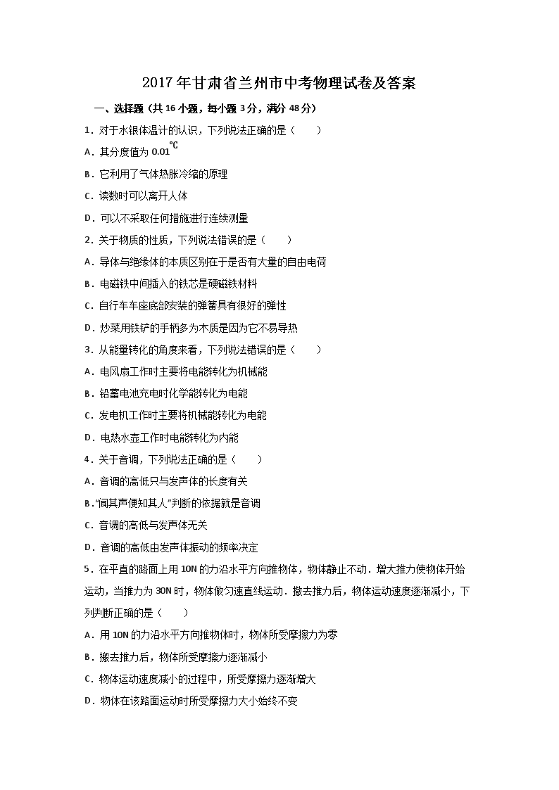 【文档预览】 无忧考网整理发布2017年甘肃省兰州市中考物理试卷及答案(Word版),前五页预览如下: