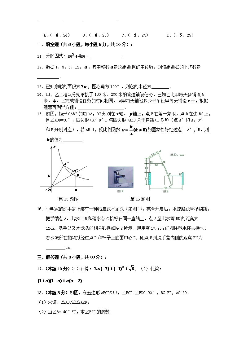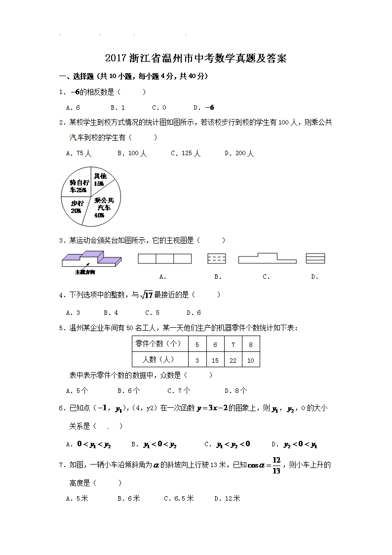 【文档名称】 2017浙江省温州市中考数学真题及答案(Word版).doc