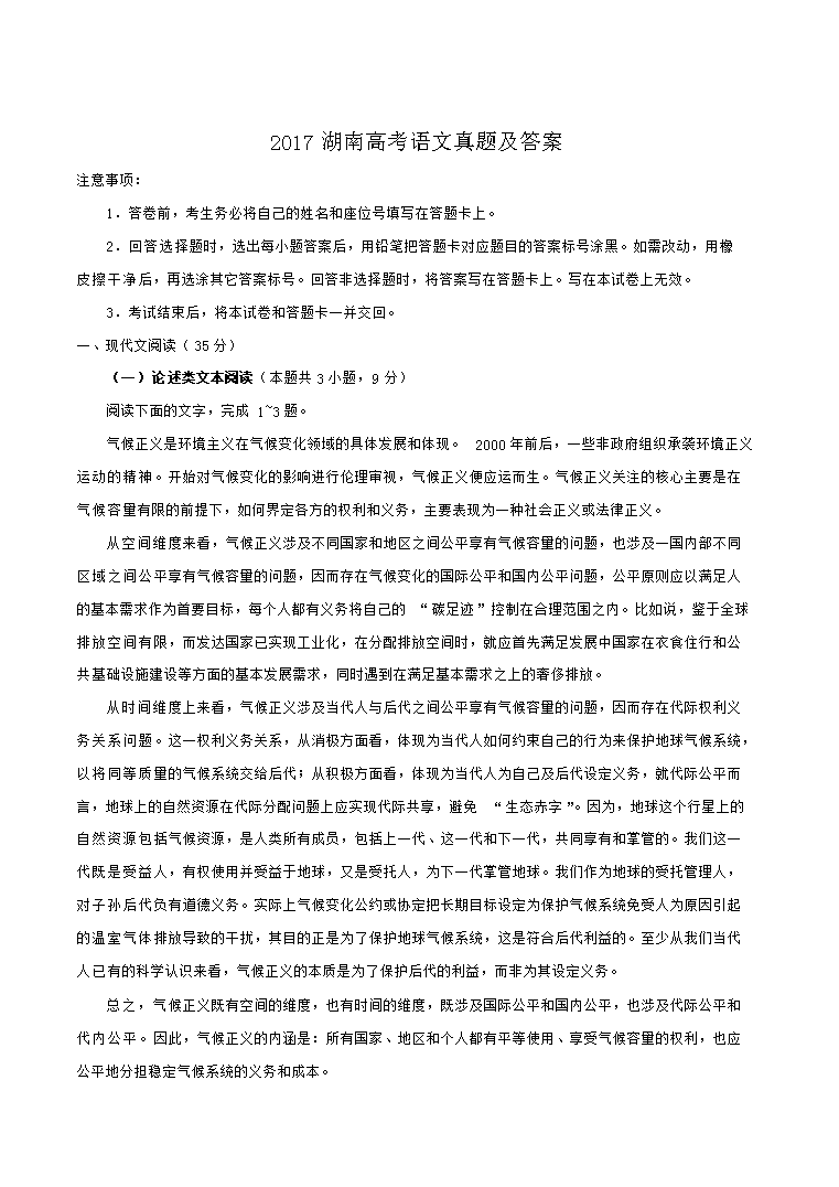 【文档名称】 2017湖南高考语文真题及答案(Word版).doc