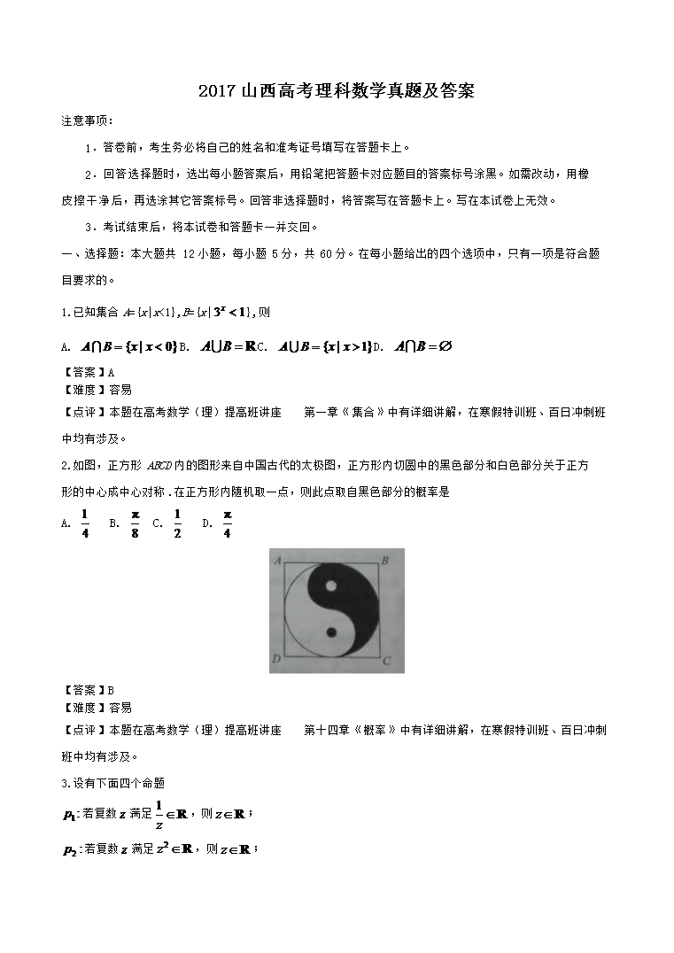 【文档名称】 2017山西高考理科数学真题及答案(Word版).doc