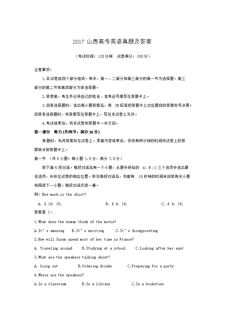 【文档预览】 无忧考网整理发布2017山西高考英语真题及答案(Word版),前五页预览如下: