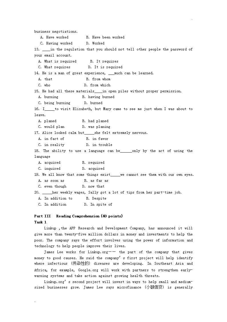 【文档预览】 无忧考网整理发布2017年重庆专升本大学英语真题(Word版),前五页预览如下: