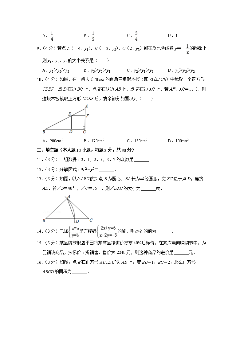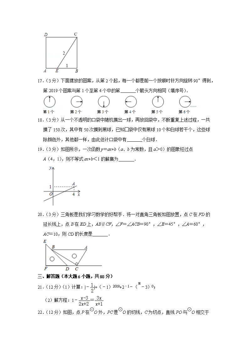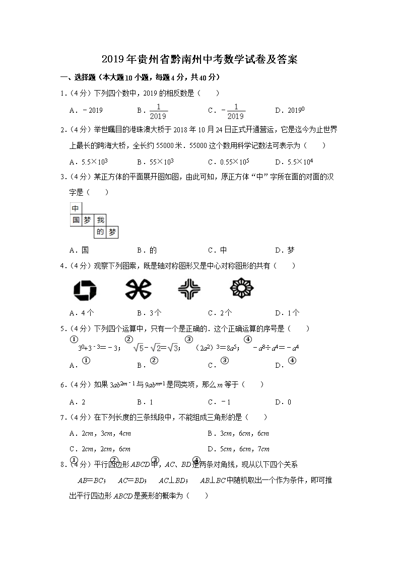 【文档名称】 2019年贵州省黔南州中考数学试卷及答案(Word版).doc
