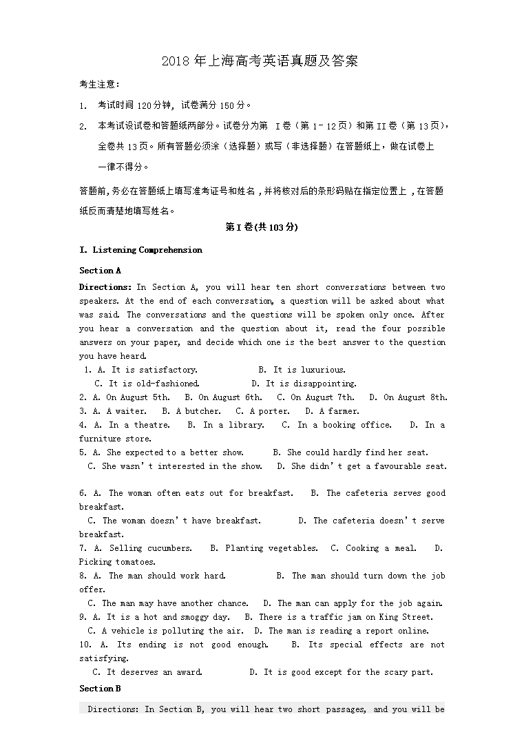 【文档预览】 无忧考网整理发布2018年上海高考英语真题及答案(Word版),前五页预览如下: