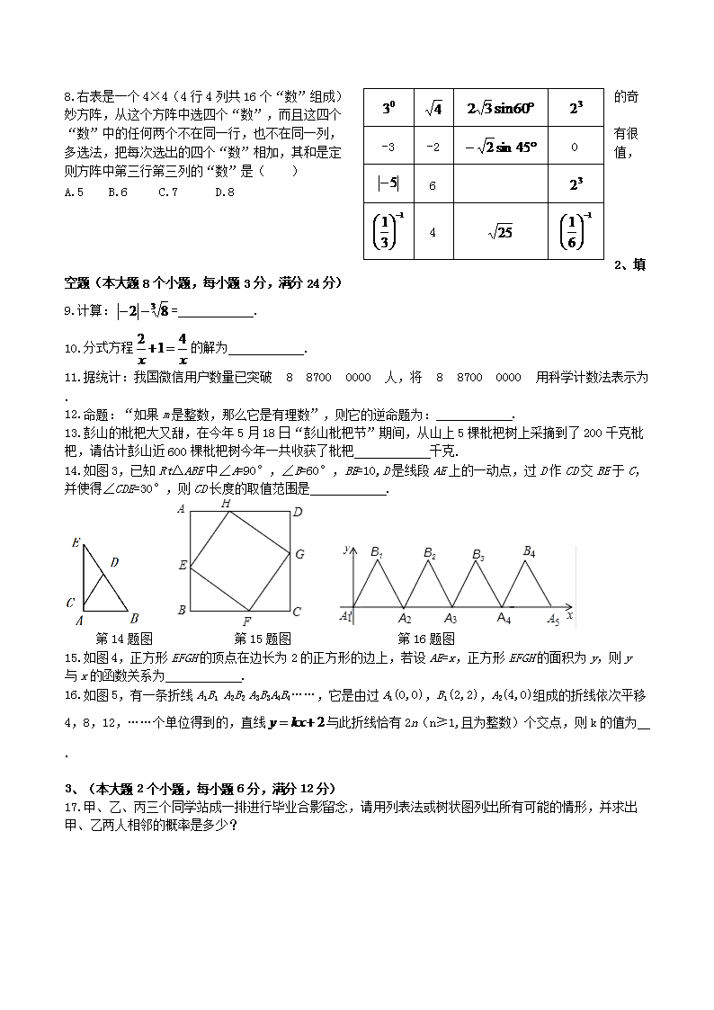 【文档名称】 2017年湖南省常德市中考数学真题及答案(Word版).doc