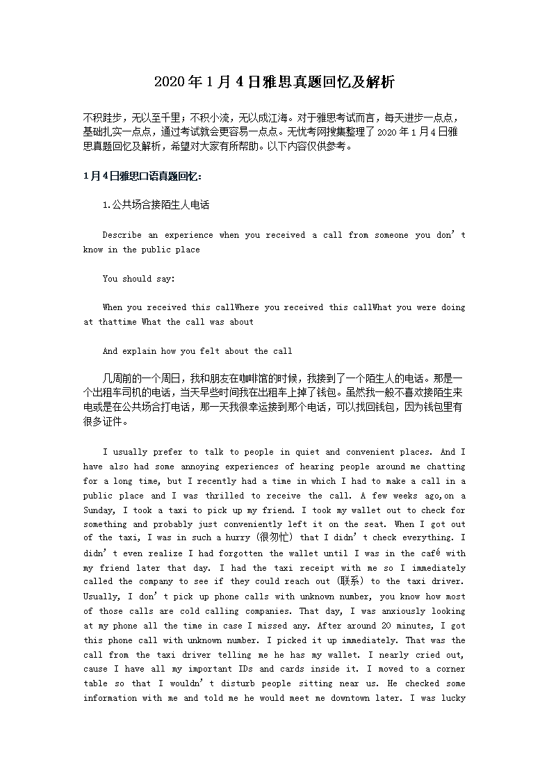 【文档预览】 无忧考网整理发布2020年1月4日雅思真题回忆及解析(Word版),前五页预览如下: