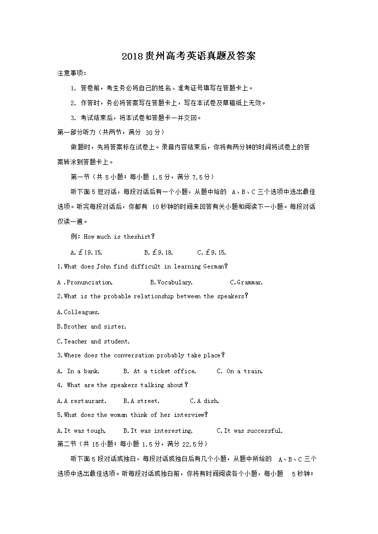 【文档预览】 无忧考网整理发布2018贵州高考英语真题及答案(Word版),前五页预览如下: