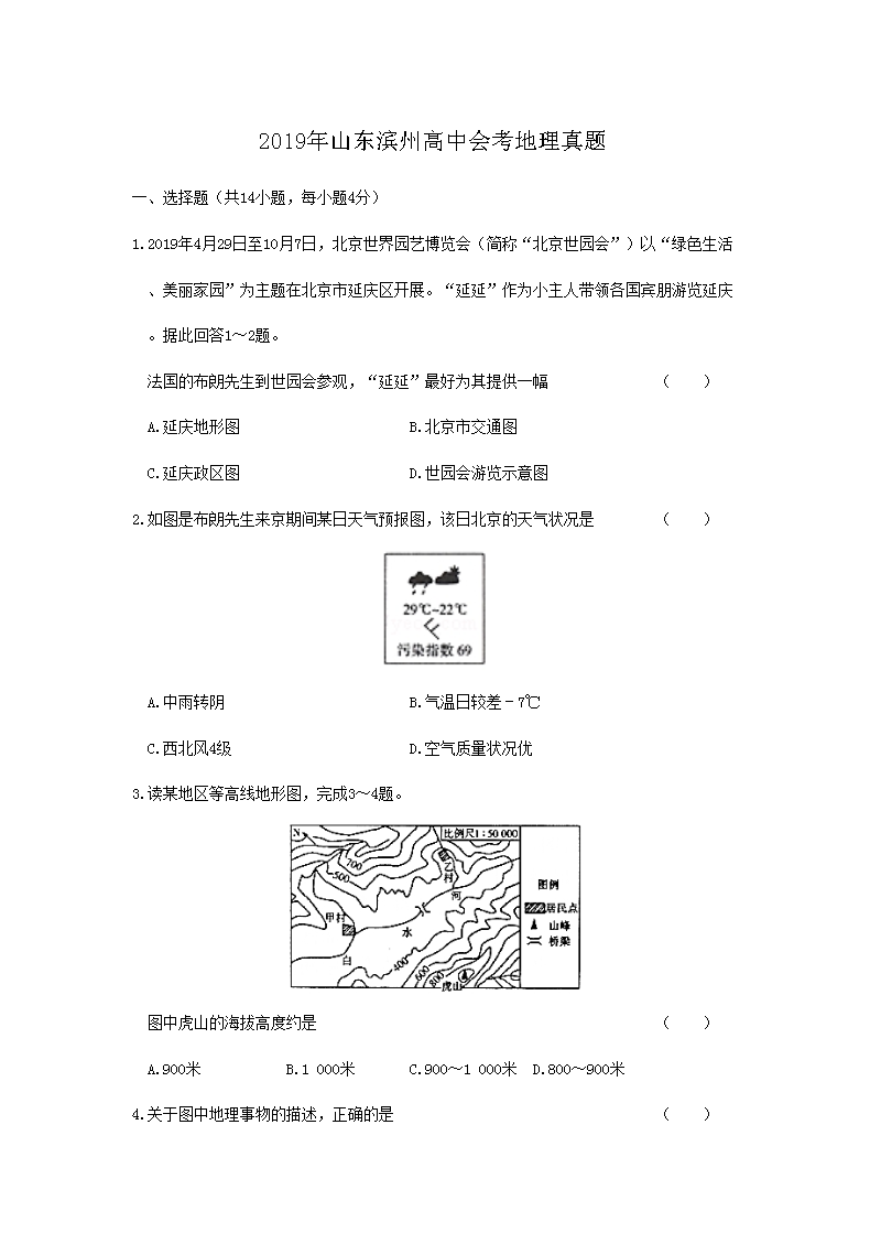 【文档预览】 无忧考网整理发布2019年山东滨州高中会考地理真题(Word版),前五页预览如下: