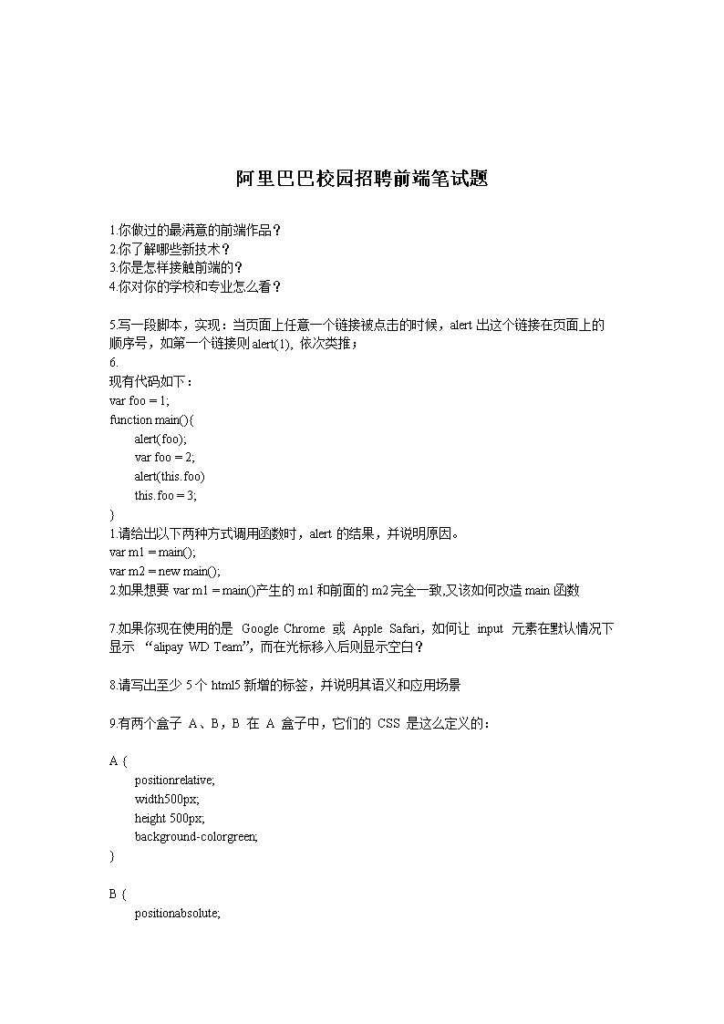 【文档名称】 阿里巴巴销售类及前端校园招聘笔试题(Word版).doc