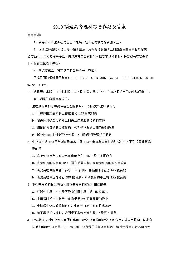 【文档名称】 2018福建高考理科综合真题及答案(Word版).doc