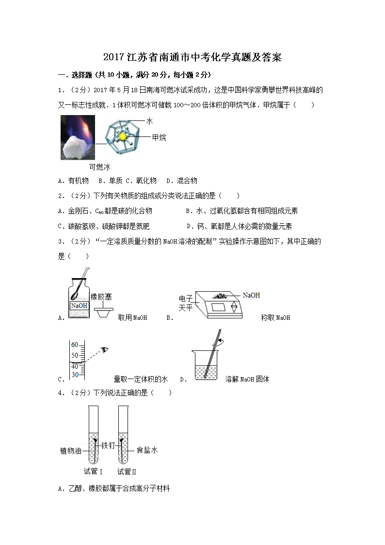 【文档名称】 2017江苏省南通市中考化学真题及答案(Word版).doc