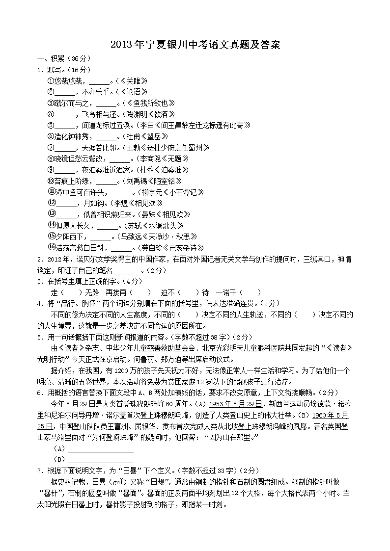 【文档名称】 2013年宁夏银川中考语文真题及答案(Word版).doc