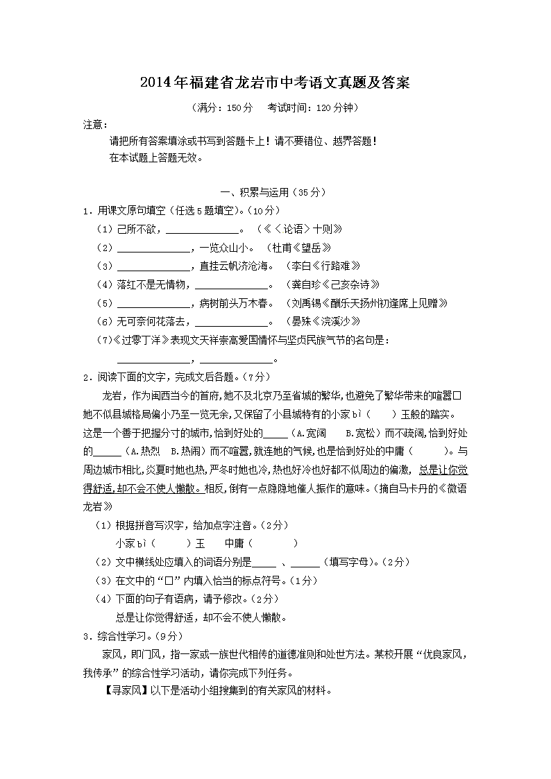 【文档名称】 2014年福建省龙岩市中考语文真题及答案(Word版).doc