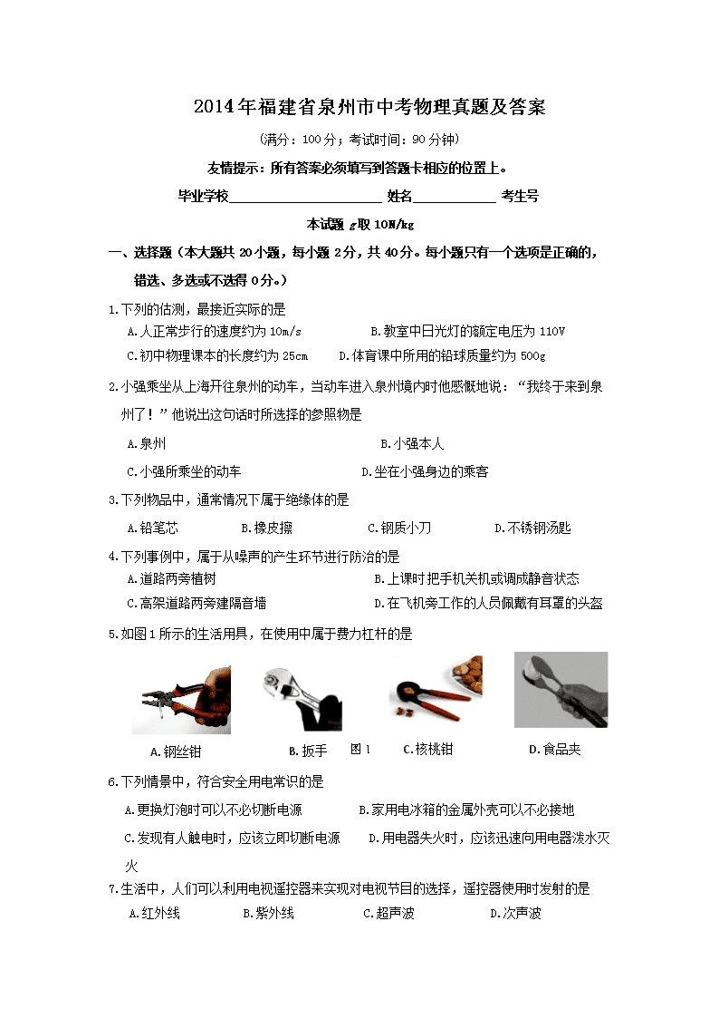 【文档预览】 无忧考网整理发布2014年福建省泉州市中考物理真题及答案(Word版),前五页预览如下: