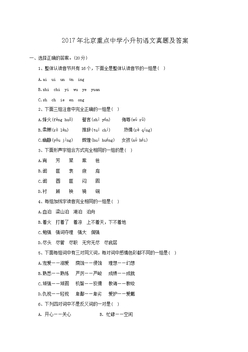 【文档名称】 2017年北京重点中学小升初语文真题及答案(Word版).doc