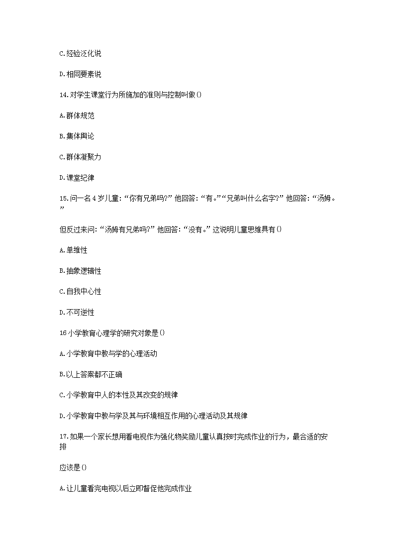 【文档名称】 2017年内蒙古教师资格考试教育心理学(初等)真题及答案(Word版).doc